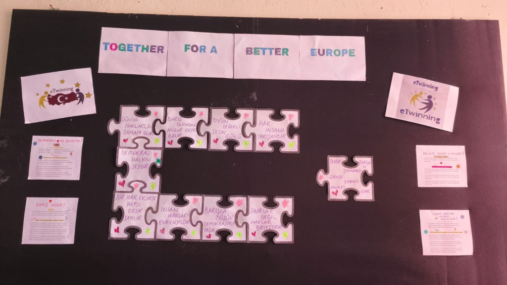 İngilizce ÖğretmenlerimiZ Tuğba AYDIN, Nesrin AKSU ve Türk Dili ve Edebiyatı Öğretmeninimiz Yasemin ZÜLFİKAROĞLU'nun koordinatörlüğünde yürütülen e-twinning projesi "TOGETHER FOR A BETTER EUROPE" projesi Mart ayından bu yana öğrencilerimizin de katılımıyla devam etmektedir.Öğretmenlerimiz ve öğrencilerimiz proje kapsamında demokrasi, sürdürülebilir yaşam, medya okuryazarlığı ve anayasa başlıkları altında çalışmalar yürütmüş, panolar hazırlamış ve sonunda ortak ürün olarak "KÖKLERDEN GELECEĞE"(FROM ROOTS TO THE FUTURE) isimli dijital dergi hazırlamışlardır. Öğretmen ve öğrencilerimizi tebrik ediyoruz.